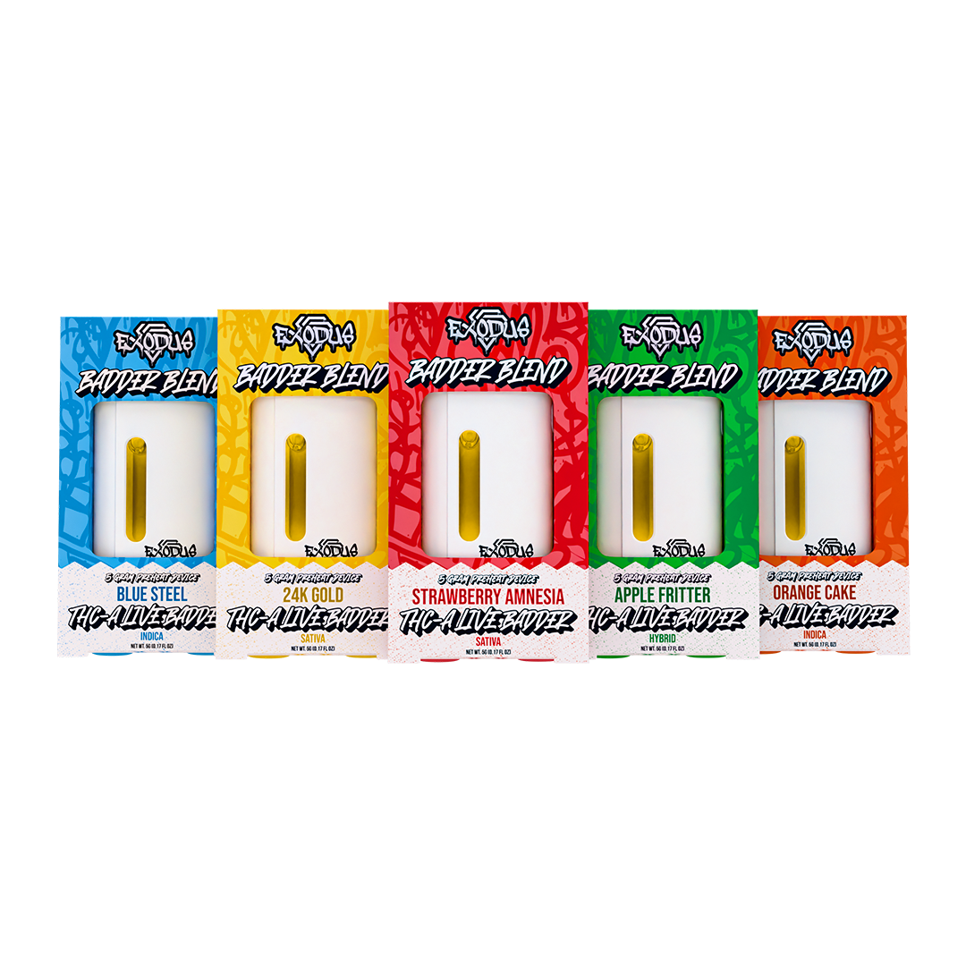 Bigger and better than ever, our Badder Blend collection features 5-gram Disposables equipped with USB-C charging, preheat functions, and dual coils for quicker heat and hits. Packed into a sleek device, these disposables hold 5 grams of our proprietary blend of THCA Live Badder, HXY 9-THC, and Delta 8-THC Live Resin.